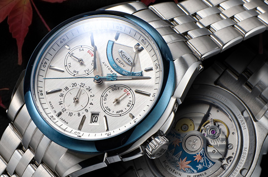 高精度28,800振動、26石のハイビートに、パワーリザーブ表示、日付、月、曜日表示も備えたマルチファンクション仕様で、Kentexが誇る本格自動巻き式のドレススポーツモデルとなっています。