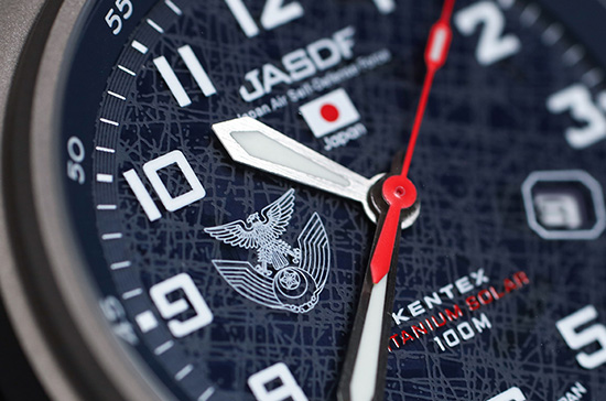 文字盤は、防衛省幕僚監部協力による陸・海・空、各自衛隊の公式エンブレム(徽章)が入る誇り高きデザイン。 大きめのアラビアインデックスと太いバトン針により、高い視認性を確保しています。