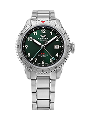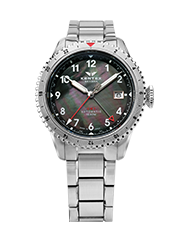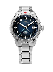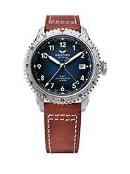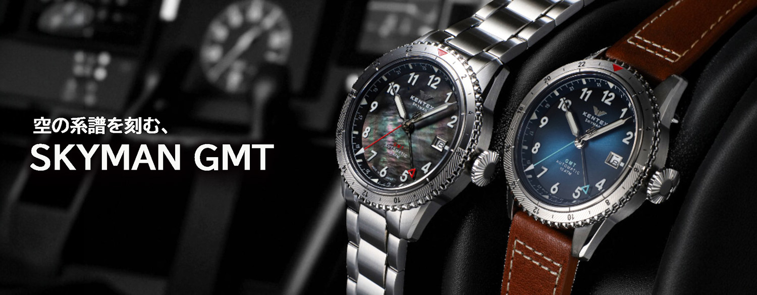 SKYMAN GMTは、日本製自動巻きムーブメントと最大3つのタイムゾーンを表示するGMT機構を搭載。無反射コーティングを施したサファイアガラスがクリアな視界を確保し、強蓄光アラビアインデックスは昼夜を問わず高い視認性を発揮。パイロットウォッチの伝統を受け継ぐビッグクラウンと、100M防水による確かな実用性を備えた、本格派の「ジャパンメイドGMT」です。