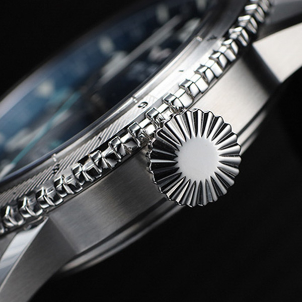 リューズは、グローブ越しでも確実に操作できるビッグクラウン仕様で、往年のパイロットウォッチを想起させるクラシックなデザイン。確かな実用性と伝統が息づく繊細なディテールです。