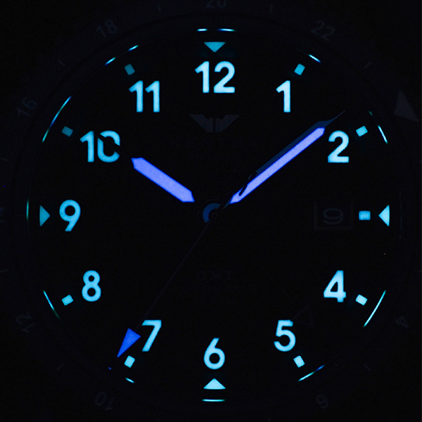 インデックスと針にはブルーの強蓄光を施し、暗所においても確かな視認性を確保。深い闇の中で鮮やかに浮かび上がるブルーの発光は、星々の輝きを思わせる神秘的な美しさで、実用性とともに幻想的な魅力を放ちます。※03,04はグリーン蓄光です。