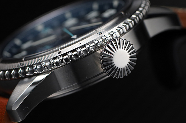 風防には無反射コーティングを施したサファイアクリスタルを採用。日本製ムーブメントは自社で0~+25秒まで精密に調整し、確かな精度を実現しています。