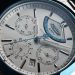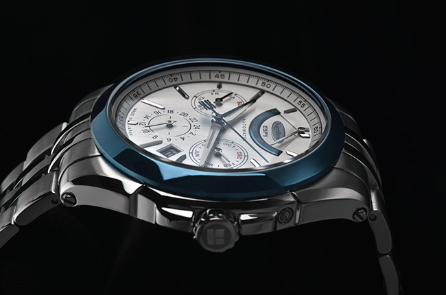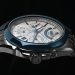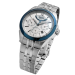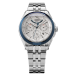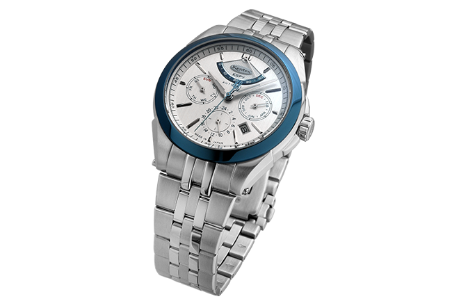 国産ハイビート(28,800振動)ムーブメントを搭載し、パワーリザーブ、日付、月、曜日表示を備えたトリプルカレンダー仕様。