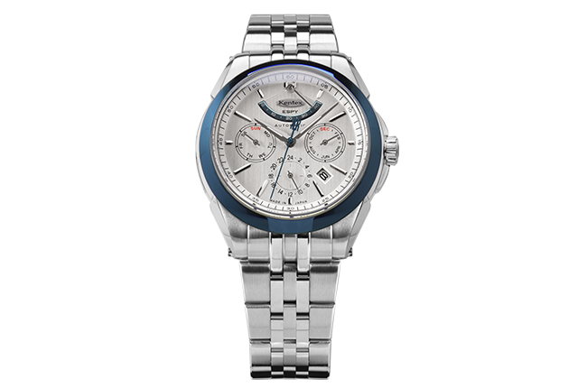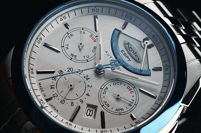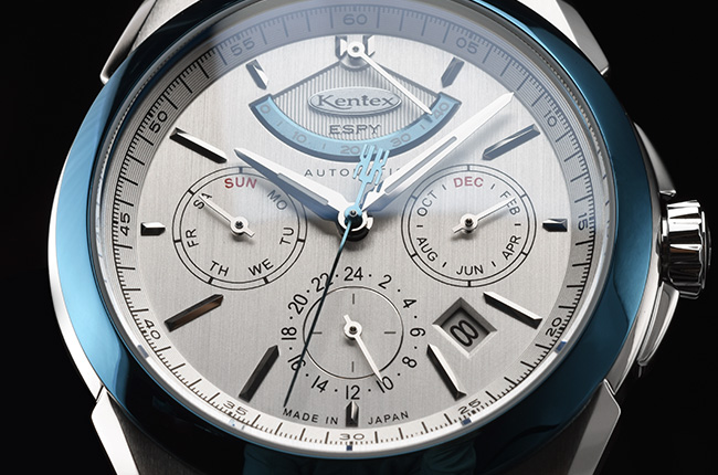 Φ41mmのケースに、程よい存在感を放つベゼルと力強いラグがスポーティーな躍動感を演出しつつ、ヘアライン仕上げのダイヤルと、繊細でシャープなバーインデックスが織りなす静謐な美しさが見事に調和。力強さと気品を兼ね備えた、ケンテックスならではのドレススポーツデザインに仕上がっています。裏スケルトンから覗くローターには秋に色づく紅葉のモチーフが繊細にデザインされ、日本的エレガンスを感じさせる、優雅な仕上がりとなっています。